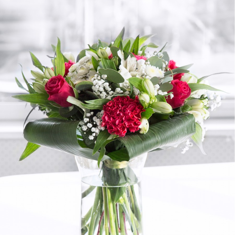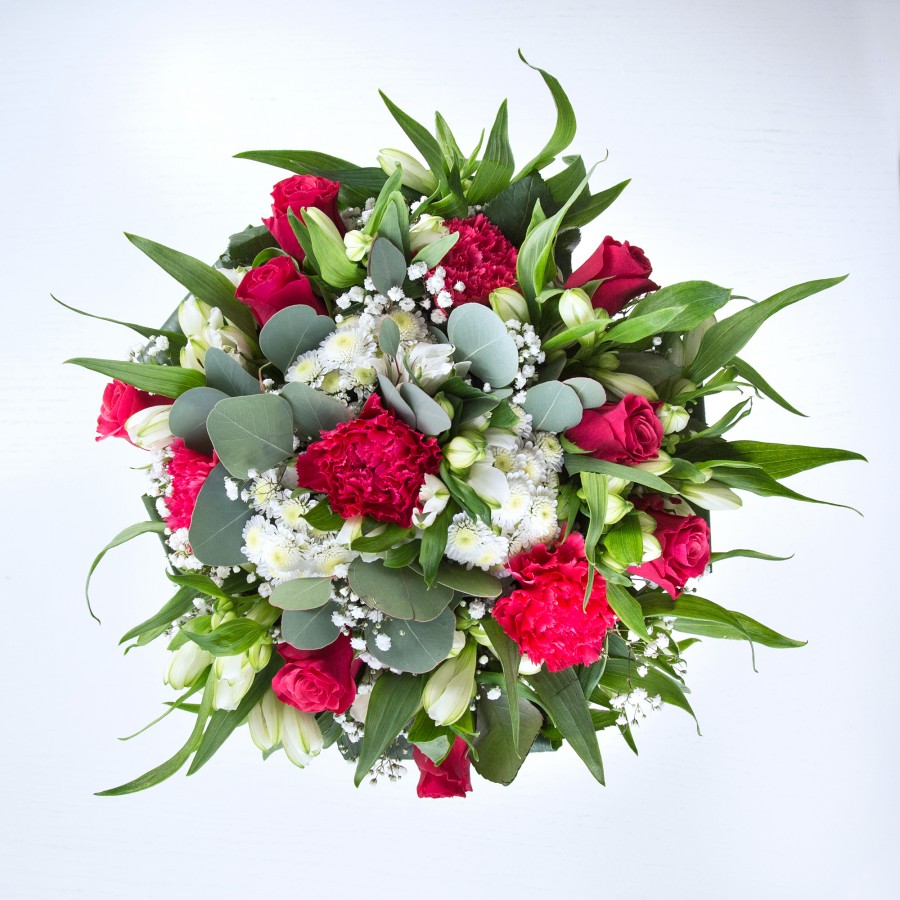 Radiate Beauty with our luxurious flower arrangement, expertly crafted to inspire and delight. This remarkable bouquet features a harmonious mix of white chrysanthemums, opulent red roses, delicate gypsophila, lively carnations, and elegant white alstroemeria, all beautifully complemented by aspidistra leaves.